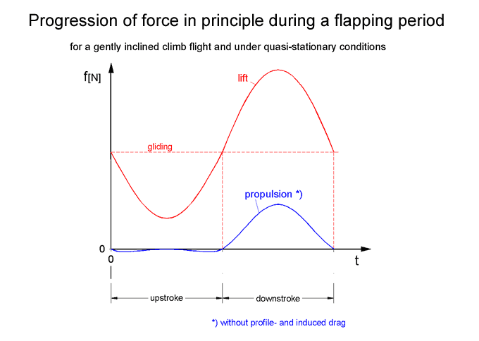 Profiled flapping wings and quasi-stationary flow conditions are presumed. Therefore, calculations only lead to useful results for a fast forward flight with a relatively low flapping frequency (like large birds; please see the description of flying with lift).