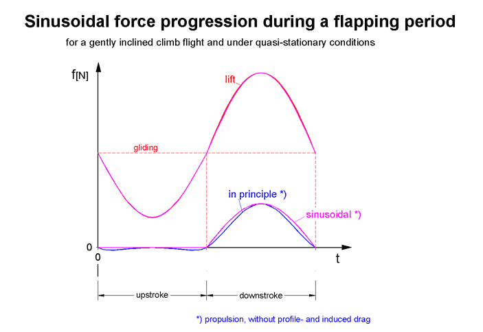 The additional calculation of data of the flying model is highly simplified. The detailed calculation of the force progression during a stroke cycle has been replaced by assuming a sinusoidal progression of the force. Thereby the accurate coupling of stroke motion and twisting remains unconsidered. Only the reference line (such as in gliding flight) and the amplitude of the sine half-wave in the middle of each wing beat are determined. With that, the area under the curve progression or the size of a force is approximately calculable.