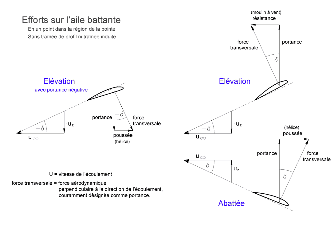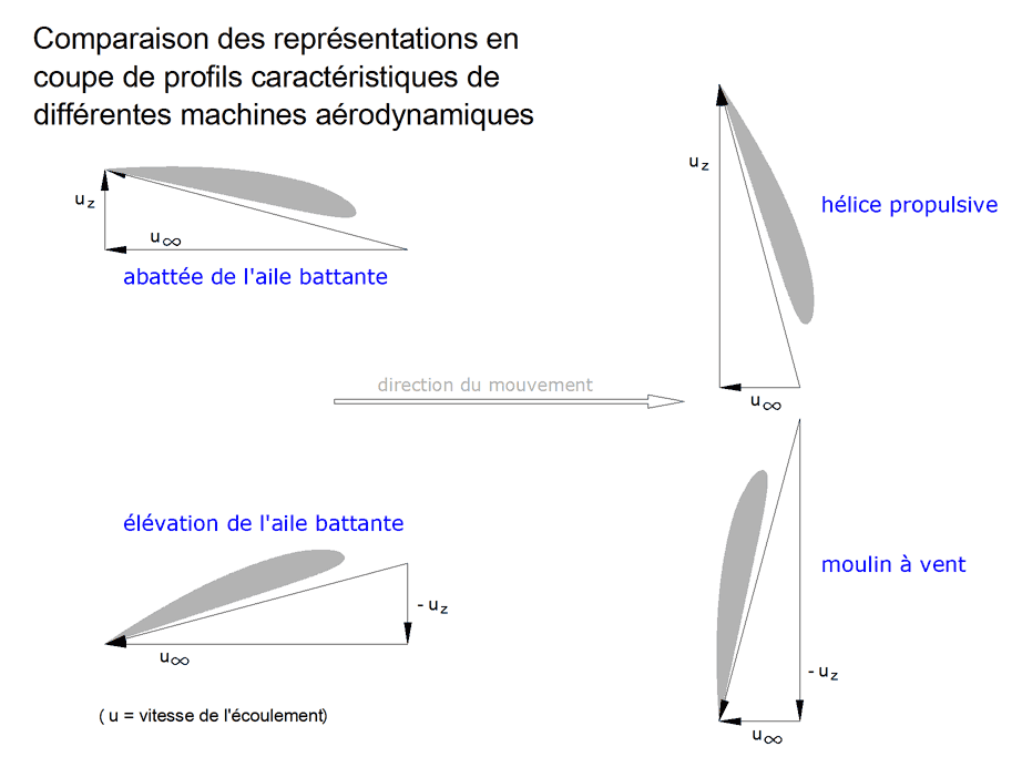 Les images ci-jointes ont pour but de montrer les divergences dans chacun de ces cas avec l'hélice propulsive ou l'aile de moulin à vent. Les rapports de grandeur des vitesses sont très différents dans le cas de l'aile battante. Les machines rotatives ne sont certes pas conçues pour fournir de la portance simultanément à la poussée.