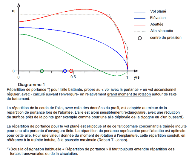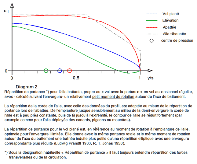 La répartition de la portance donnée pour le battement d'aile en élévation des oiseaux - donc avec portance près du corps et sans portance dans le domaine externe de l'aile - est à peine réalisable le long de l'envergure de l'aile par suite du compromis de pression qui s'y établit. Une répartition de la portance selon laquelle la production s'arrête au milieu de l'aile contredit aussi les lois des tourbillons (loi tourbillonnaire de Helmholtz). Les oiseaux sont à coup sûr dans la situation de réduire sérieusement lors du battement d'aile en élévation la production de portance dans la région externe de l'aile. En même temps, ils peuvent par nécessité disposer les forces de portance qui restent encore là positives et négatives de façon telle que la portance moyenne de la région externe de l'aile soit nulle. C'est ce qu'on peut voir sur les diagrammes ci-dessus mentionnés (par exemple pour le vol ascensionnel à platt, diagramme 2 et le vol de croisière horizontal, diagramme 4).