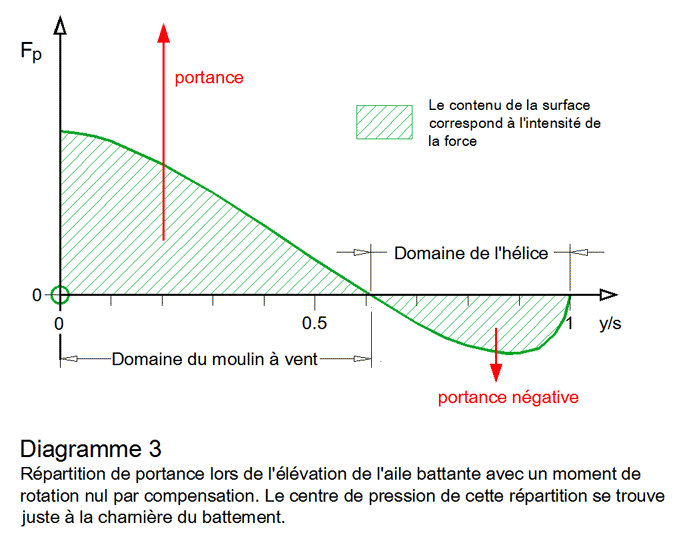 Lors du battement d'aile en élévation, les forces aérodynamiques sont réparties le long de l'aile par une torsion appropriée de l'aile de façon que les moments de rotation autour de l'articulation de l'aile se compensent exactement ( voir la vue suivante diagramme 3). Ainsi, la section de l'aile située près du corps, fonctionnant comme une aile de moulin à vent, entraîne la section externe à travailler comme une hélice. Ceci est une première possibilité d'utiliser l'énergie de moulin à vent.
