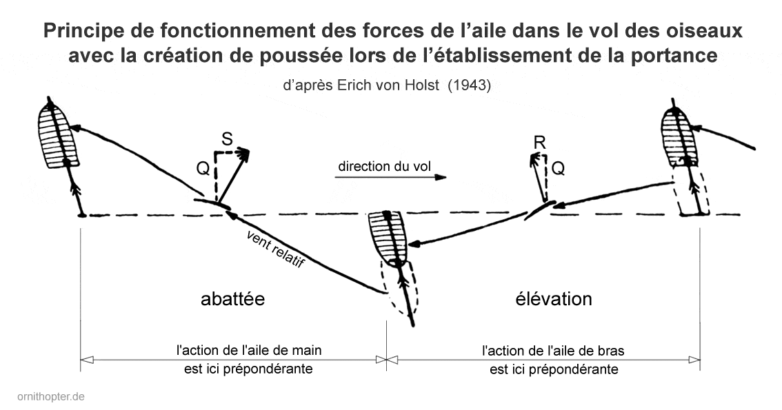 Les oiseaux utilisent à la fois la production de leur portance pour créer leur propulsion, c'est-à- dire de la poussée. E. von Holst a représenté cela sur le schéma suivant très suggestif. La situation du centre de la répartition de la portance y est matérialisée par un élément de l'aile déplacé le long de la demi-envergure.