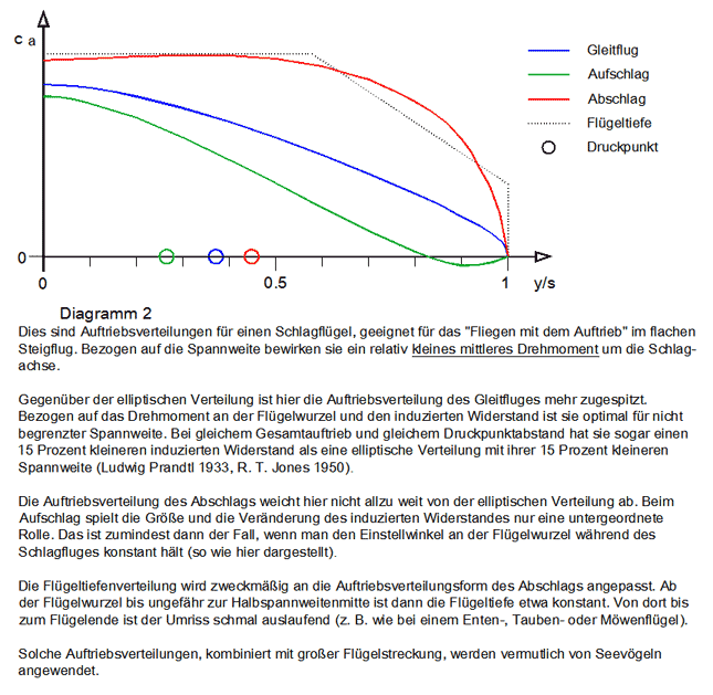 Mit diesem genialen Trick der Natur wird auch beim Aufschlag viel Auftrieb erzeugt und trotzdem, über eine ganze Schlagperiode gesehen, eine Schuberzeugung ermöglicht. Da Vögel sehr strömungsgünstig geformt sind, genügt bei ihnen für den Reiseflug eine relativ kleine Auftriebsverlagerung (siehe zum Beispiel die Lage der Druckpunkte im Diagramm 4, oben).