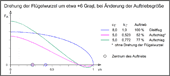 Im Rechenmodell wird die Drehung der Flügelwurzel ausgehend von der Gleitflugstellung angegeben. Sie wird nur indirekt durch die Wahl der Auftriebsgröße festgelegt. Dazu wird der Zirkulationsfaktor kΓ verwendet (der Zirkulationsfaktor k-Gamma beschreibt die Größe des Auftriebs bezogen auf den des Gleitflugs). In nebenstehendem Bild beträgt der Auftrieb, bei Drehung der Flügelwurzel beim Aufschlag um etwa +6 Grad, fast 80 % des Gleitflugs.