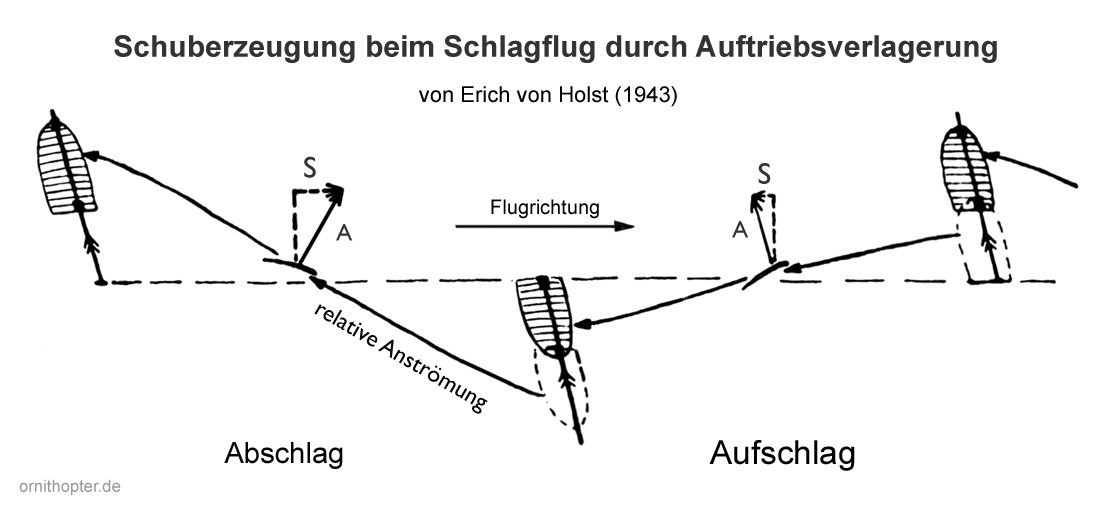 In nebenstehendem Diagramm skizziert E. v. Holst (1943) (PDF 3.2 MB), wie bei Vögeln die mit großem Fortschrittsgrad fliegen, eine optimale Schuberzeugung im Prinzip erfolgen kann. Sein Gedankenexperiment wird hier etwas modifiziert. Die dargestellten verschiebbaren Flügel sollen hier nicht wirklich verschoben werden, sondern lediglich die verschiebbare Lage des Auftriebszentrums verkörpern.